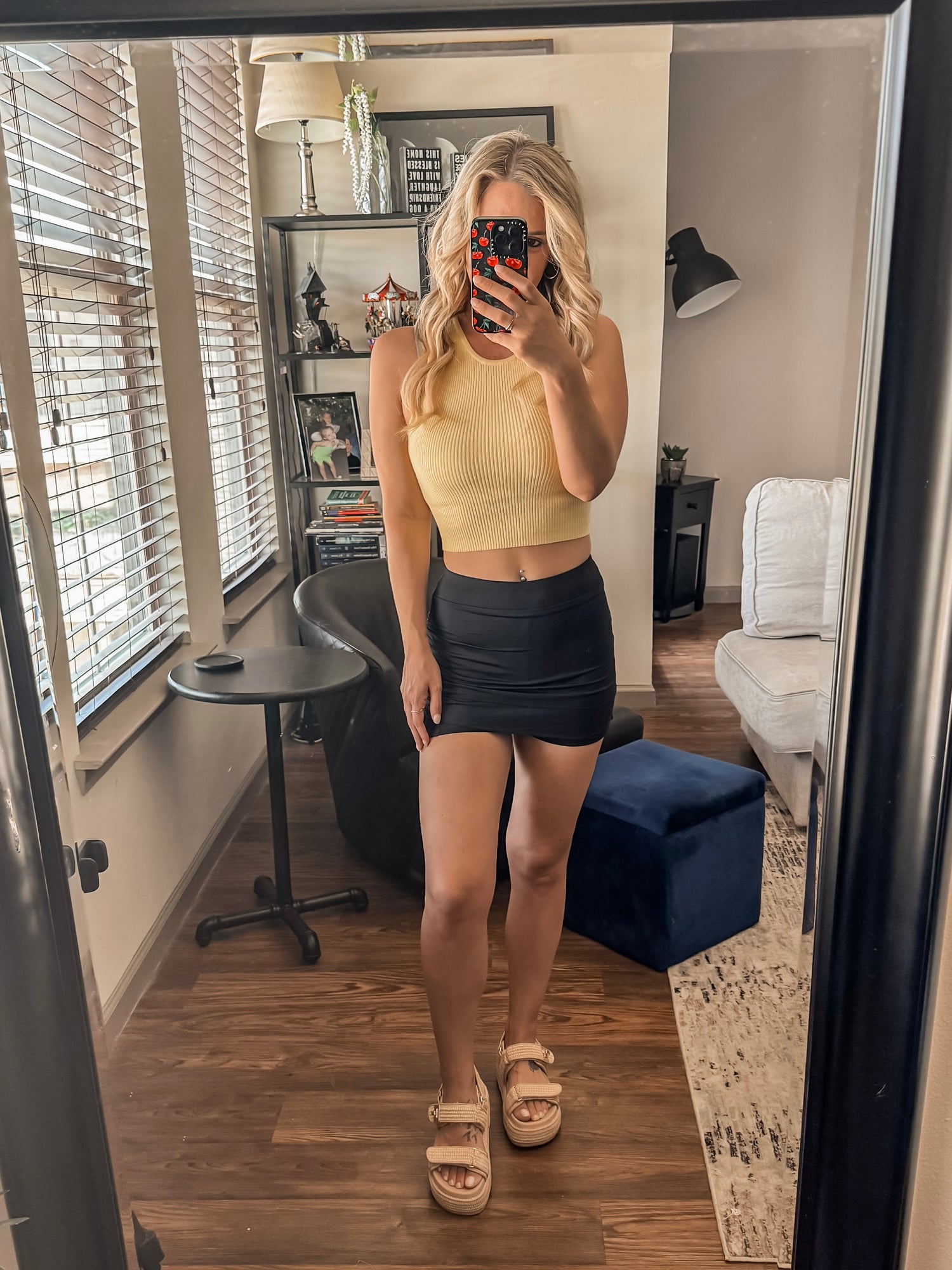 Flirty, fitted, and made to move. This black ruched skort features built-in shorts for comfort and coverage, with a curve-hugging fit that flatters every step. Dress it up or down — it’s your new go-to.