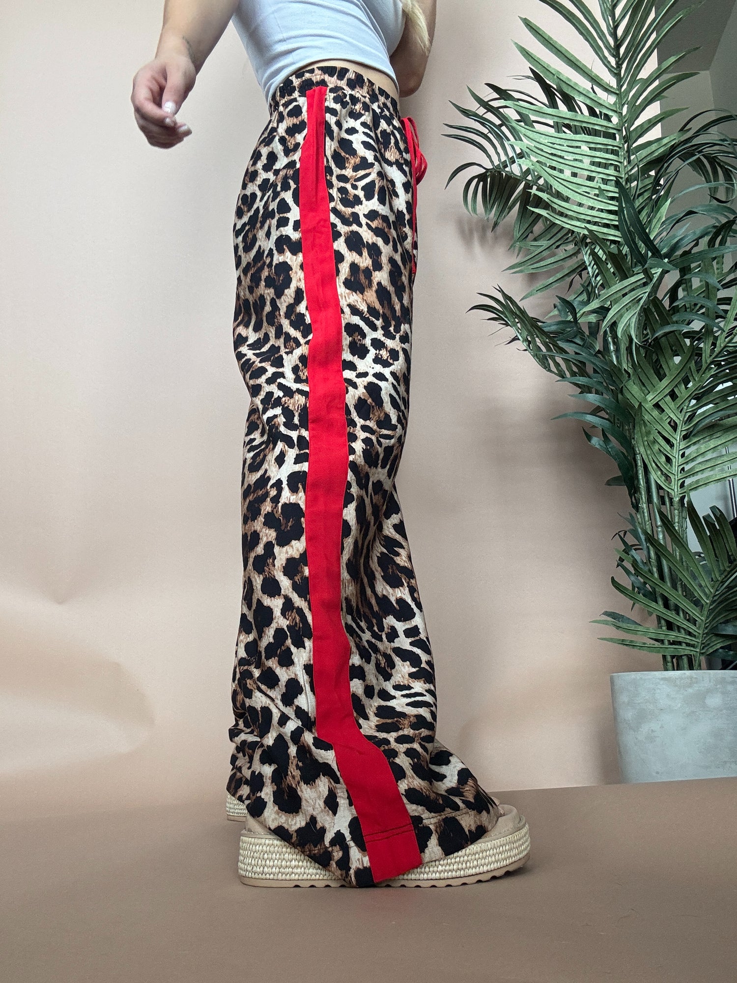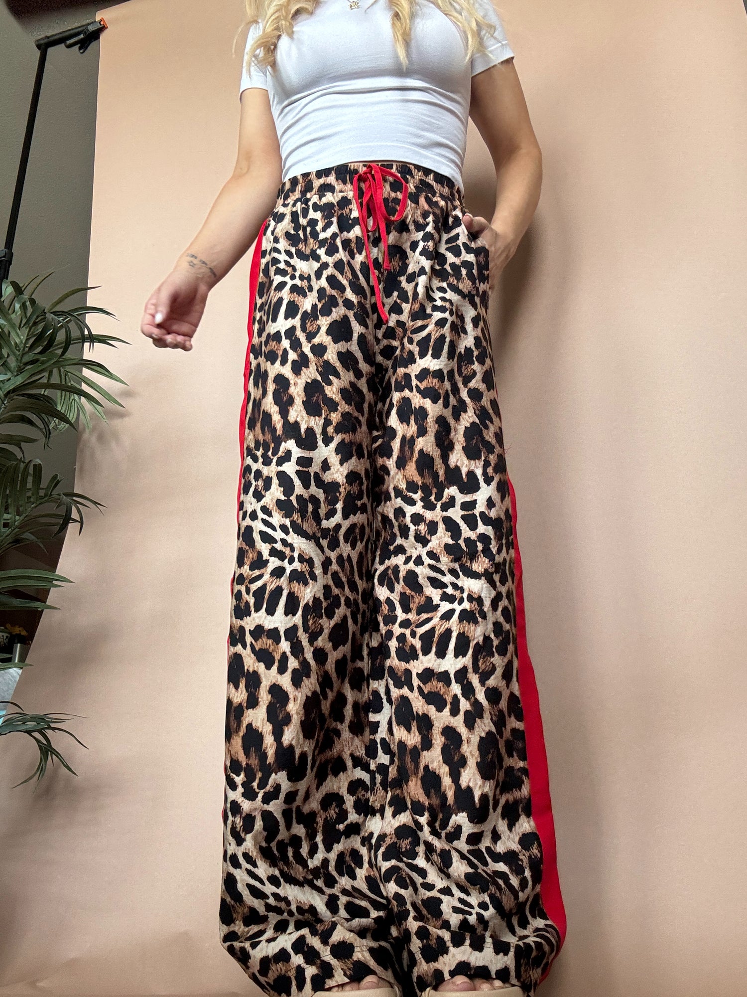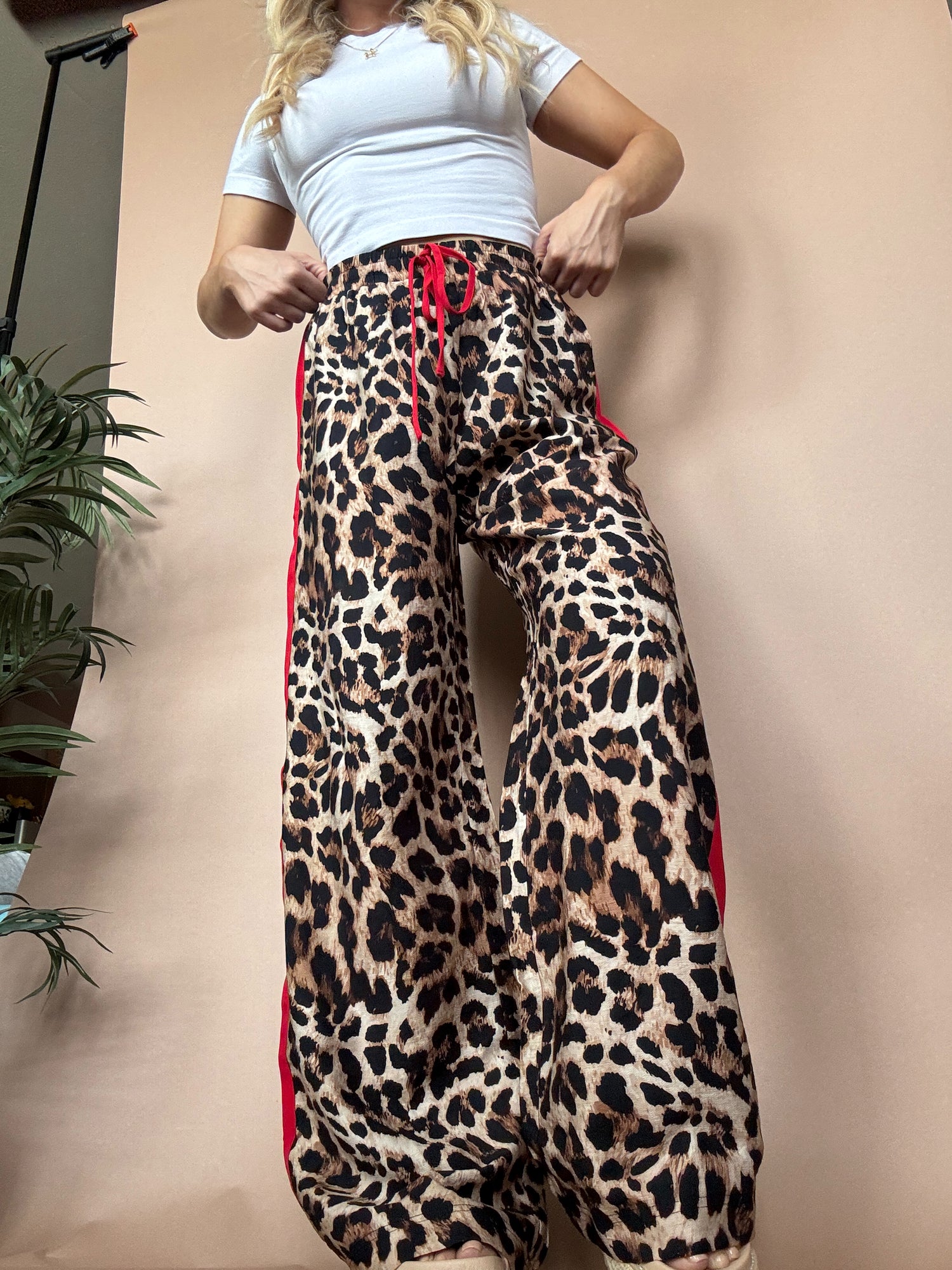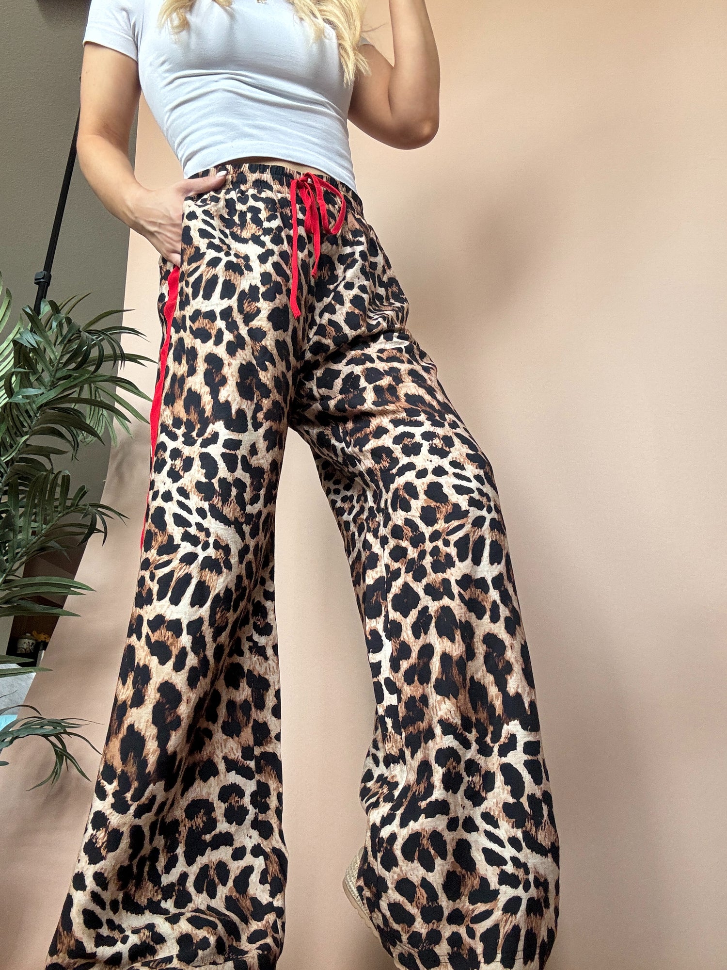 Unleash your wild side. Leopard print, wide leg trouser fit with drawstring elastic waist band.